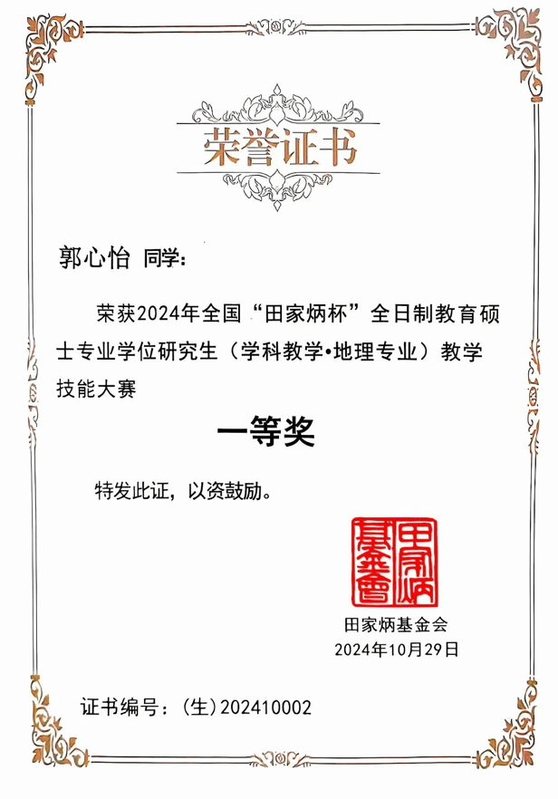 2023级学科教学(地理)专业研究生郭心怡荣获全国一等奖,刘展宏教师获“优秀指导教师”奖。