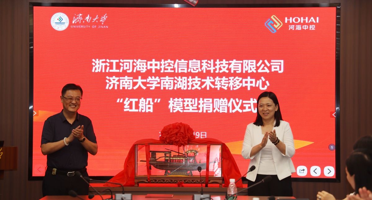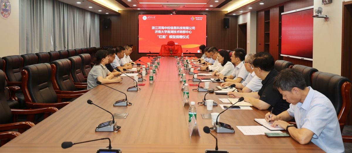 校企合作伙伴,浙江河海中控信息科技有限公司为学校捐赠“红船”模型一个。公司董事长、九三学社社员朱骏玮一行4人,学校党委常委、副校长商华,党委常委、组织部部长滕晋,党委常委、统战部部长徐庆国出席捐赠仪式。学科建设与发展规划处处长、九三学社果冻传媒