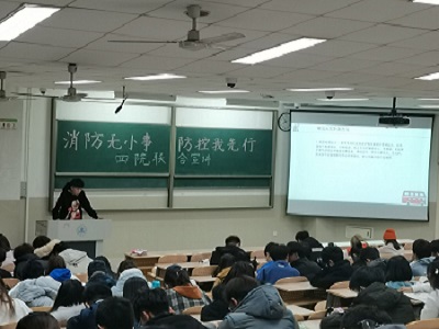 首先,四院代表通过PPT的形式轮流上台进行消防安全知识宣讲,主讲人通过图文结合的方式向同学们讲解了火灾的成因、火灾的预防措施以及发生火灾时的逃生小技巧。随后,主讲人结合真实案例着重讲解了学生宿舍消防安全知识。大学校园是人员高度聚集的公共场所,尤其是学生宿舍,为了确保同学们的人身安全,不要在宿舍内使用大功率电器,不要购买和使用质量不合格的插座、充电器等三无产品,不要在宿舍内储存易燃物品,要自觉学习和掌握火场逃生常识。在接下来的问答环节中,主持人通过有奖竞答的方式对所讲消防知识进行了回顾,同学们积极参与其中,气氛十分热烈。宣讲接近尾声时,同学们在黑板上签下自己的名字,通过自己的行动表示对此次宣讲的支持。最后,主持人呼吁同学们积极向身边的家人、朋友宣传消防安全知识。在日常生活中敲响消防安全的警钟,增强防火安全意识,牢记消防安全知识,预防火灾的发生。