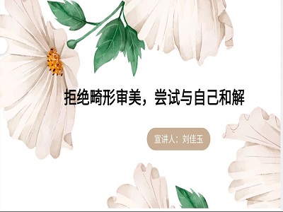 本次宣讲以“拒绝畸形审美,尝试与自己和解”为主题,宣讲人首先播放了分别从男生视角、女生视角这两个视角来看待美的视频,引发了同学们深深的思考;接着又提出了“如何发现自己的美?”和“如何放大自己的美?”这两个问题,邀请同学们回答,同学们踊跃参与,发表了自己对美独到而多样的见解;最后宣讲人分别从“什么是畸形审美?”“美到底应该是什么样?”“怎样克服畸形审美?”三方面进行了详细而全面的讲解,使同学们了解如何拒绝畸形审美,找到自己的美,尝试与自己和解。