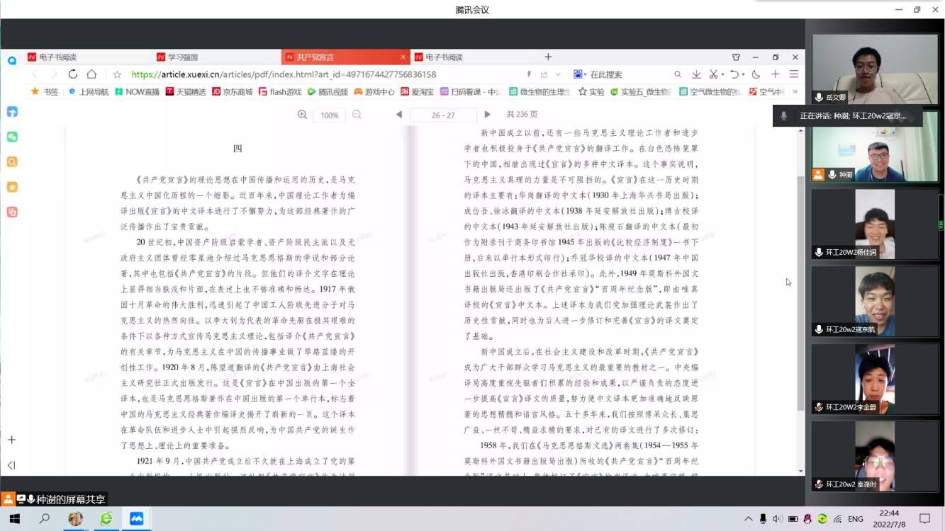 “青年党史研学社”暑期社会实践团队由指导老师白健和种澍、岳文卿、秦逢时、寇京航、李金蔚、臧少凡、李冰语、杨佳润、张心悦九名成员组成。此次实践活动旨在提高当代青年的科学文化素质,深刻学习党艰苦卓绝的发展历史。本次实践活动主要采取线上腾讯会议的方式进行,团队成员通过观看相关视频学习探讨党的发展历程,同时研究学习习近平谈治国理政、毛泽东选集、列宁选集、马克思恩格斯合集、共产党宣言、“九二共识”会谈记录等果冻传媒相关的文章和书籍,通过生动的文字更加深刻体会中国共产党党曲折而漫长探索之路。
