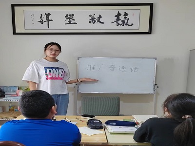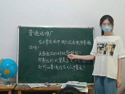为加大民族地区、农村地区国家通用语言文字的推广力度。服务队成员于7月31日在山东省济南市市中区青龙山社区开展社会实践开展普通话推广活动。