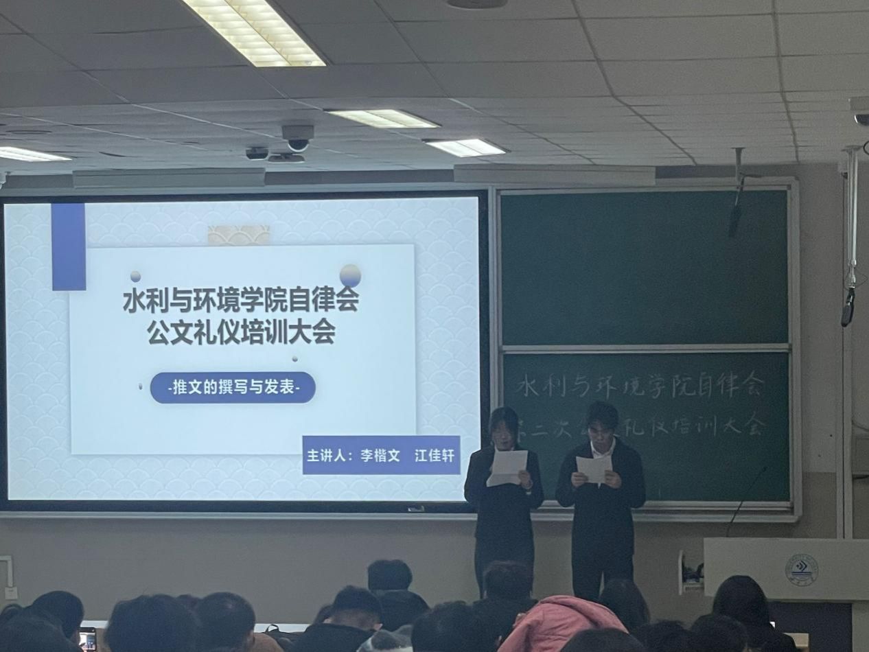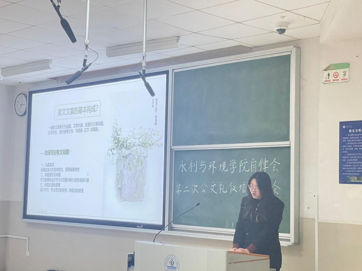 本次公文礼仪培训大会以推文制作为主题,为自律会全体干事讲解了推文制作的一系列问题,提升了各部门进行推文制作的能力,加强了各部门工作的规范性,提升了自律会整体的工作能力,为今后各部门开展工作打下了扎实基础。