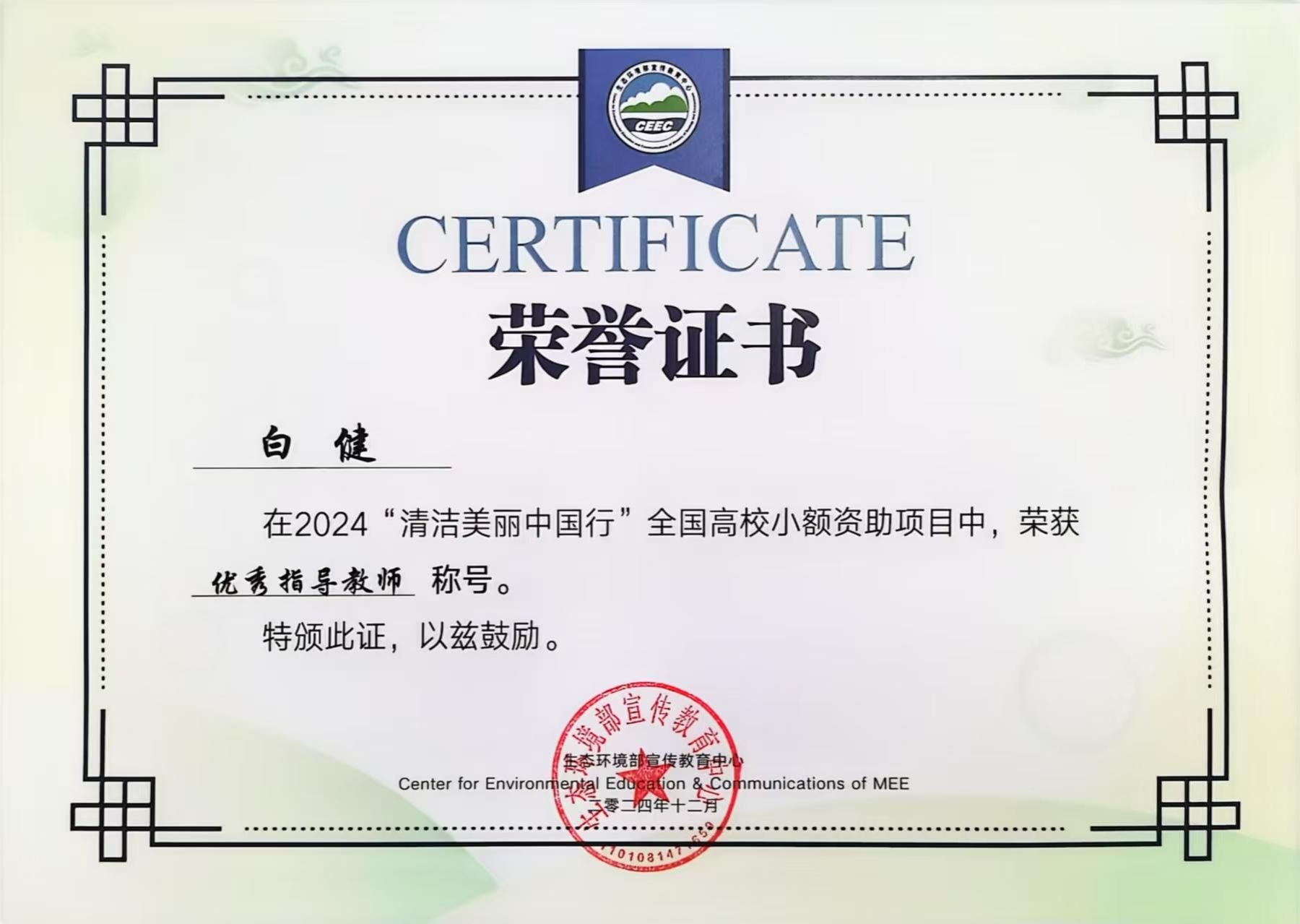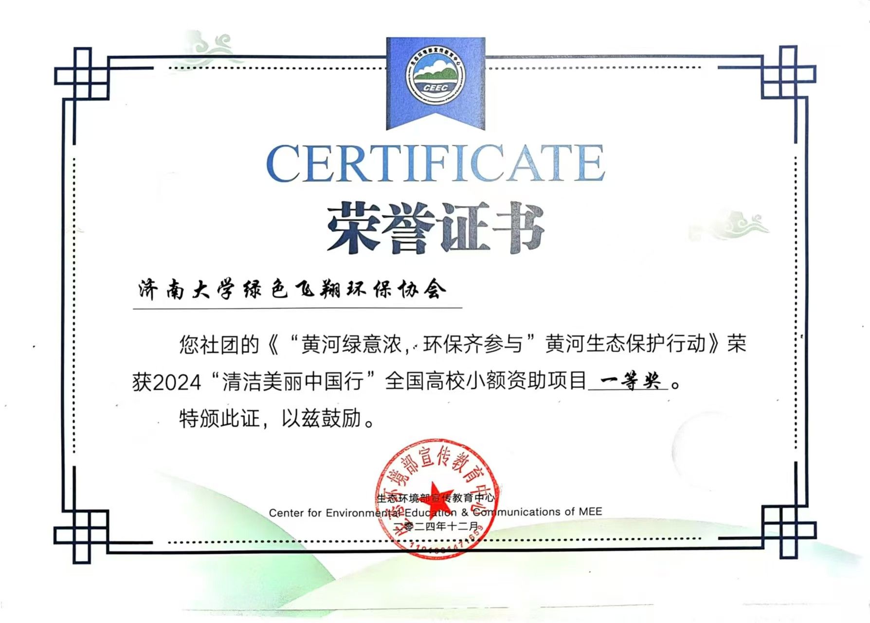 绿色飞翔环保协会凭借“‘黄河绿意浓,环保齐参与’黄河生态保护行动”项目荣膺全国唯一的一等奖,指导教师白健被授予优秀指导教师荣誉称号。