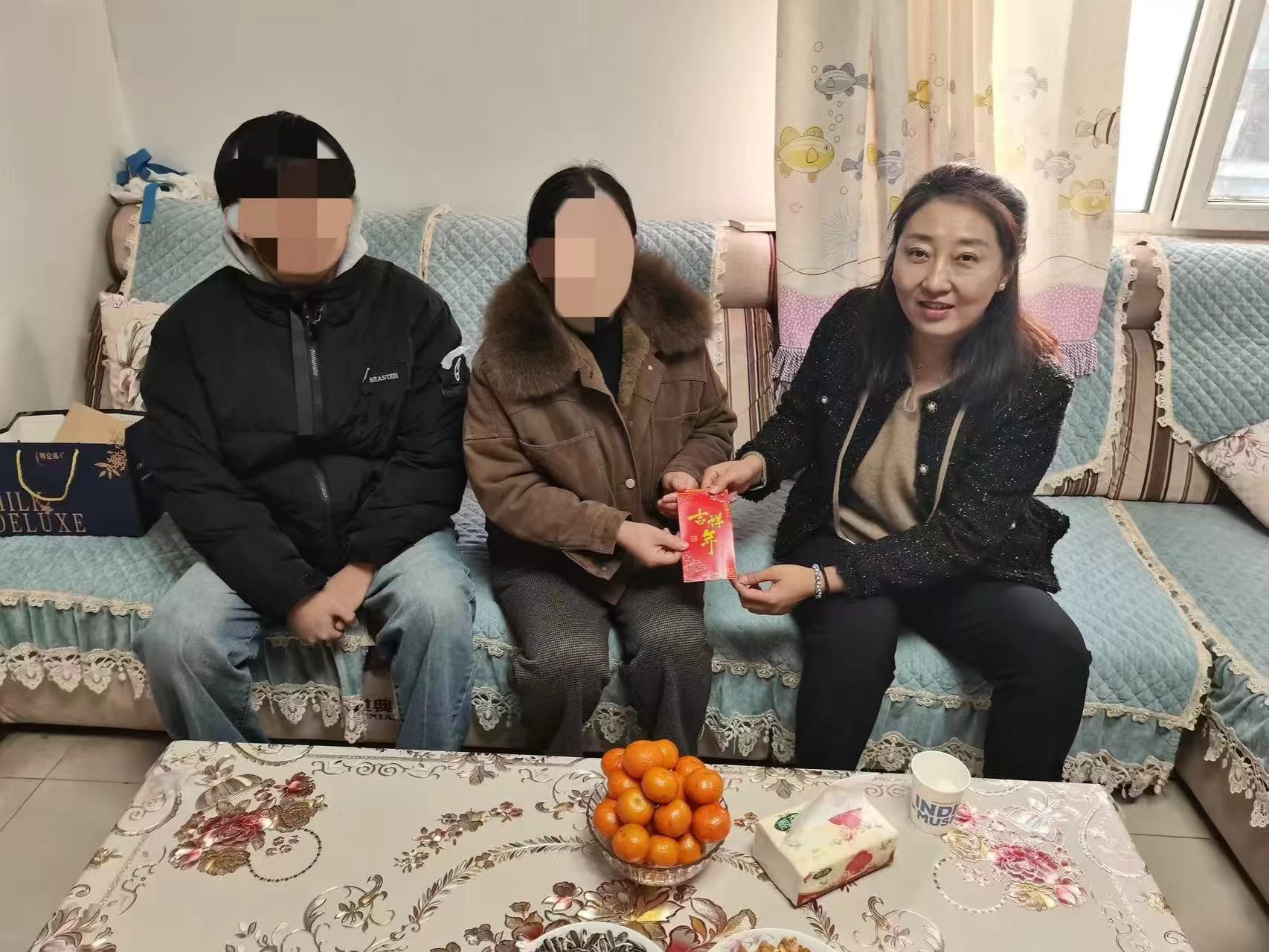 徐征和一行首先来到2024级程同学家中。见到程同学,徐征和笑意盈盈,关切询问他入学后的适应情况,勉励学生珍惜大学时光,规划好大学生涯,好好学习,全面发展。赵连柱则叮嘱程同学,假期在家学习之余,多帮父亲分担家务,为家庭减轻些生活压力。最后,一行人向学生及家长送上新年的祝福。