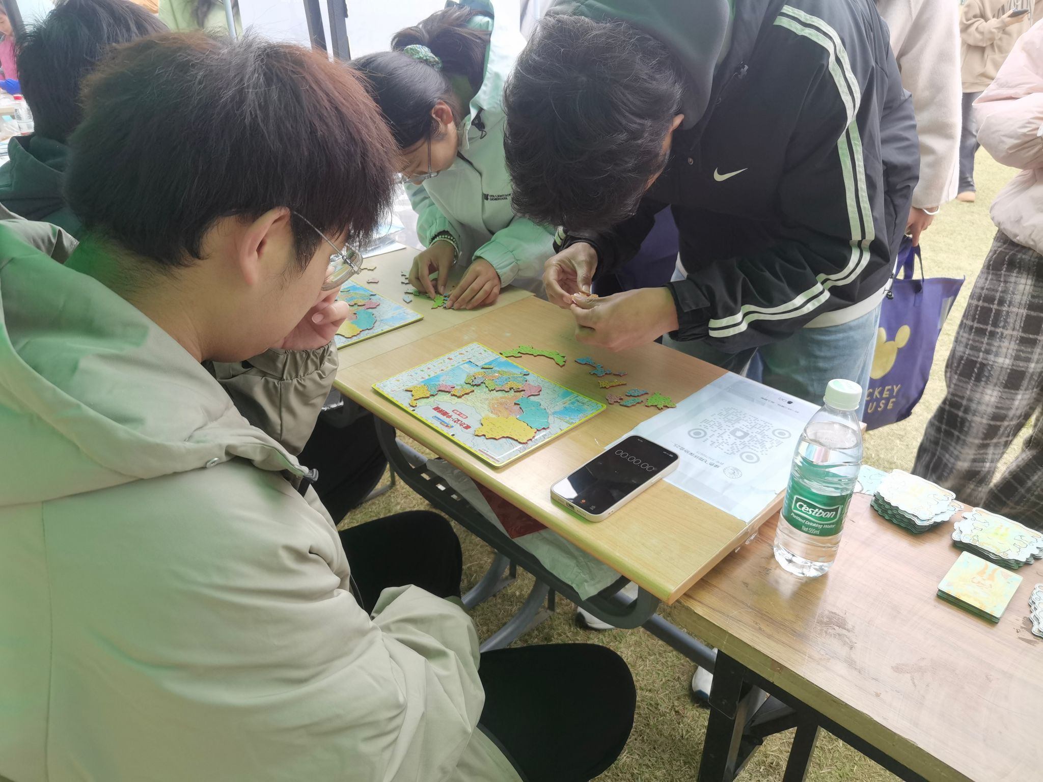 本次社团嘉年华,协会延续“守护母亲河”的核心使命,将知识性与趣味性融合,设计了一系列沉浸式环保体验项目。"沿黄九省拼图"互动区中,同学们挑战40秒完成黄河流域九省(青海、四川、甘肃等)拼图,游戏巧妙融入黄河地理知识,不少参与者拼图时自发讨论各省生态特色。