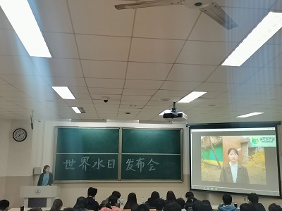 会议伊始,主持人李如悦和赵金铭向全体到会人员讲解本次活动的重要意义。主讲人梁宇莹悉心讲解世界水日和中国水周的由来和深层含义,并从现今水资源情况、水资源浪费破坏、节约用水保护水资源等几个方面深刻阐述了保护水资源的重要意义。她在演讲中穿插了生动形象的动画视频以及当代大学生对水资源现状的看法,更清楚地让同学们了解保护水资源的必要性、紧迫性,并呼吁同学们关注生态环境,增强社会责任感,做到合理用水、节约用水。
