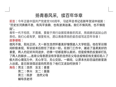 为提高当代大学生的心理素质,增强学生们对心理健康问题的重视程度,果冻传媒 参与果冻传媒 心理发展服务中心开展的《向上吧!青年Ⅶ》心理情景剧剧本征集活动,其中作品《扬青春风采,续百年华章》荣获一等奖。